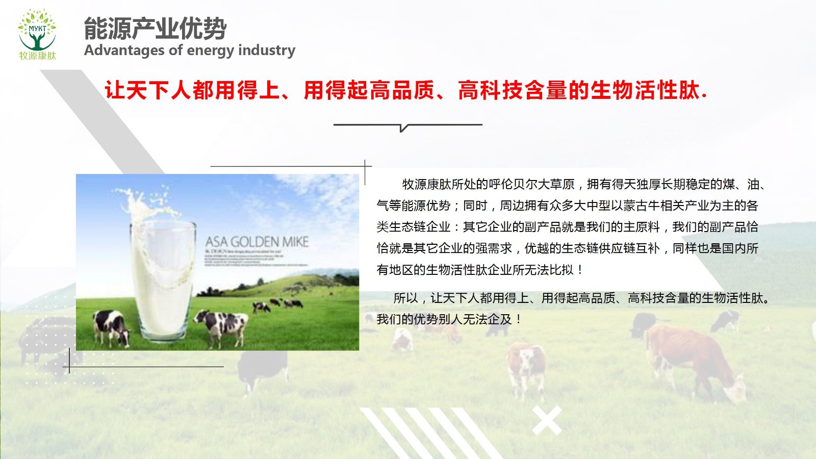 摘要:讓天下人都用得上、用得起高品質(zhì)、高科技含量的生物活性肽.牧源康肽所處的呼倫貝爾大草原,擁有得天獨厚長(cháng)期穩定的煤、油、氣等能源優(yōu)勢;同時(shí),周邊擁有眾多大中型以蒙古牛相關(guān)產(chǎn)業(yè)為主的各類(lèi)生態(tài)鏈企業(yè):其它企業(yè)的副產(chǎn)品就是我們的主原料,我們的副產(chǎn)品恰...